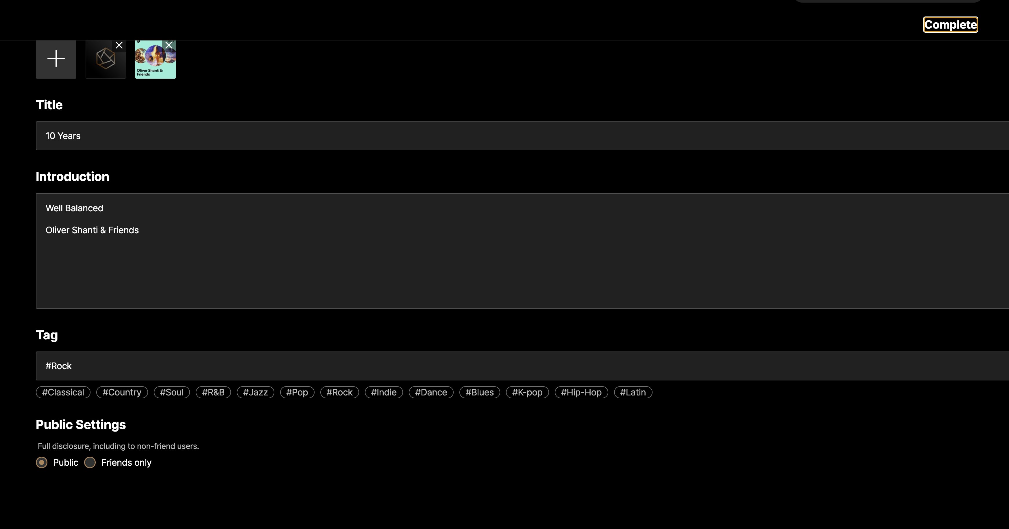 Could you please explain the exact path or steps to access that screen? - If you do not add album artwork and only modify the title, introduction, or tags, does it save normally when you press the “Complete” button?