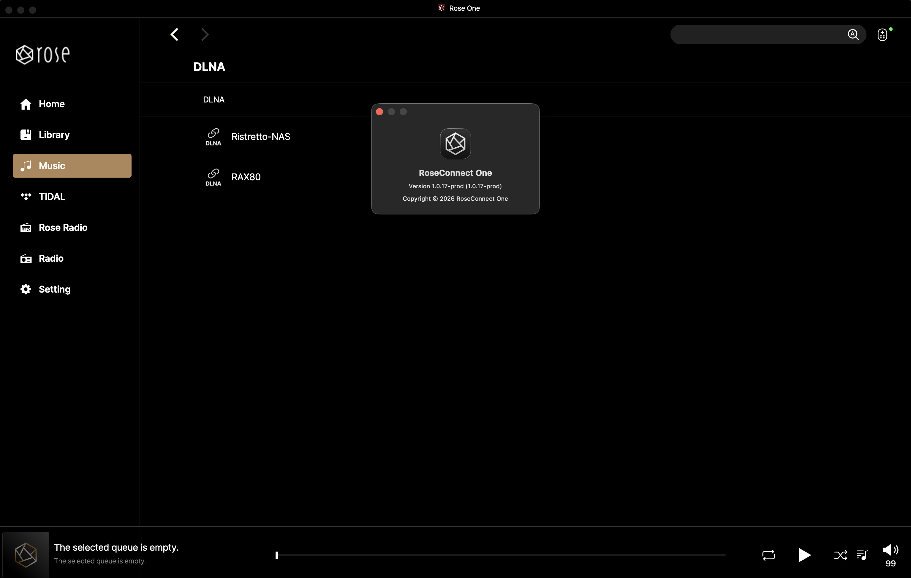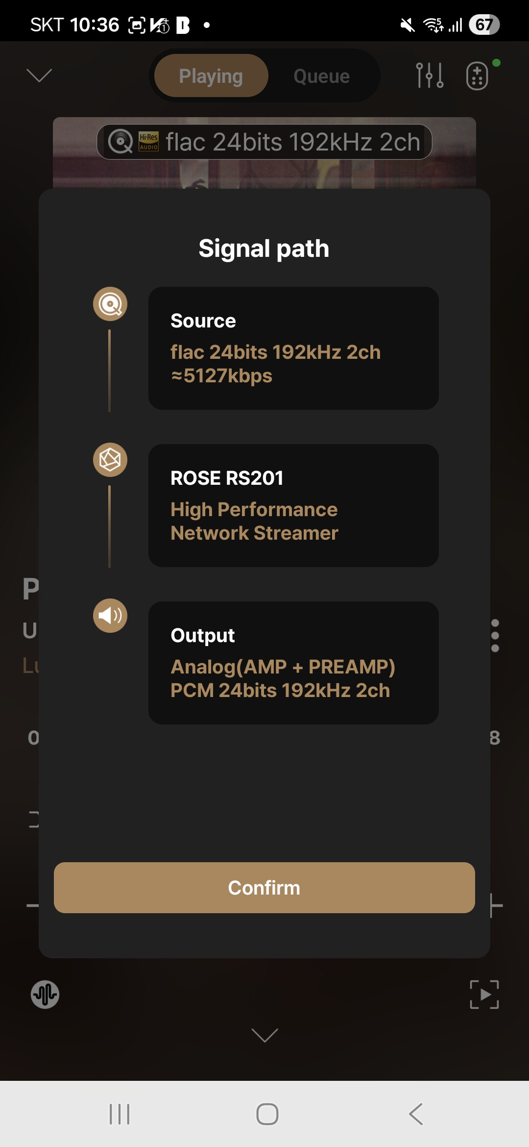 You can check the bitrate of the track you are playing, the Rose device in use, and the output settings.