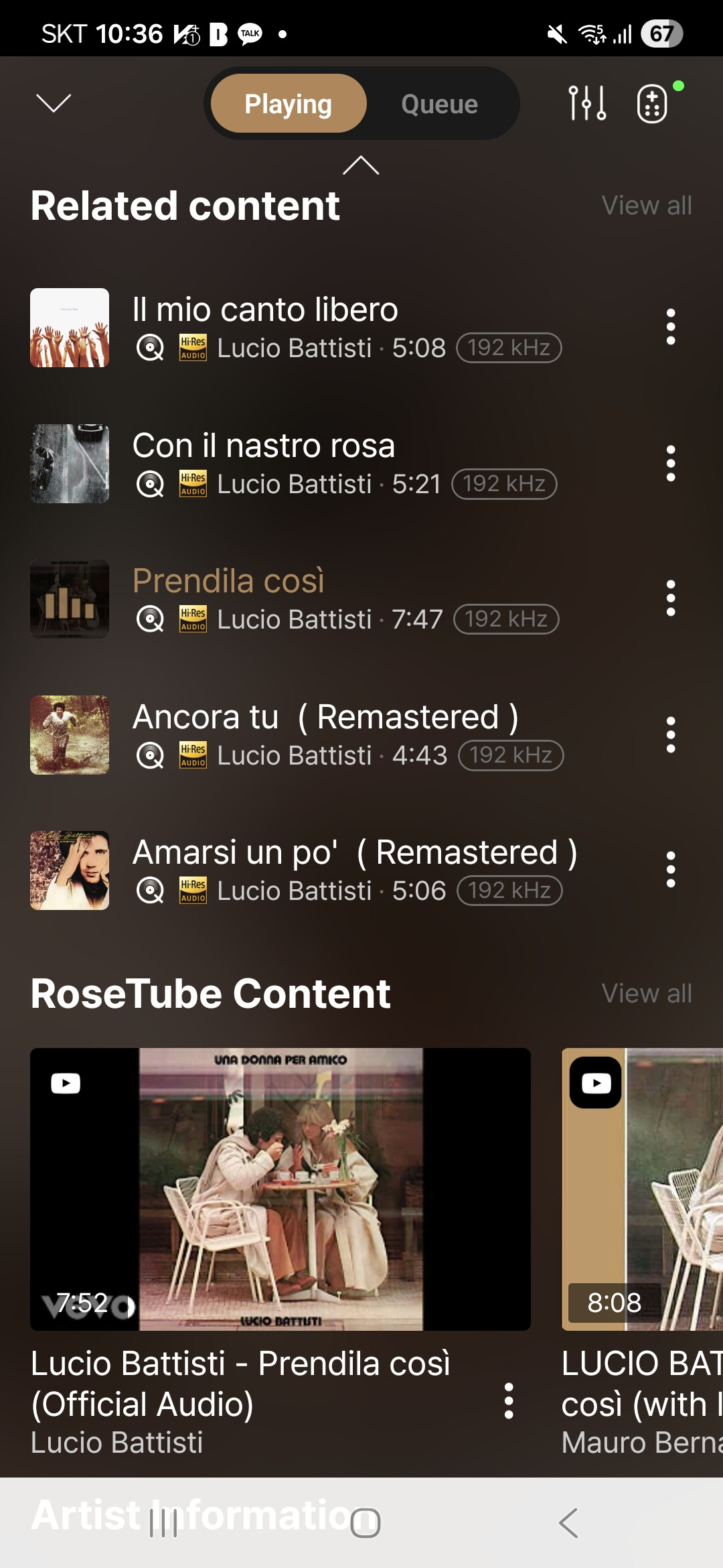 When you press the middle icon at the bottom, it will show content related to the currently playing track, including RoseTube content, artist information, and other albums by the artist.