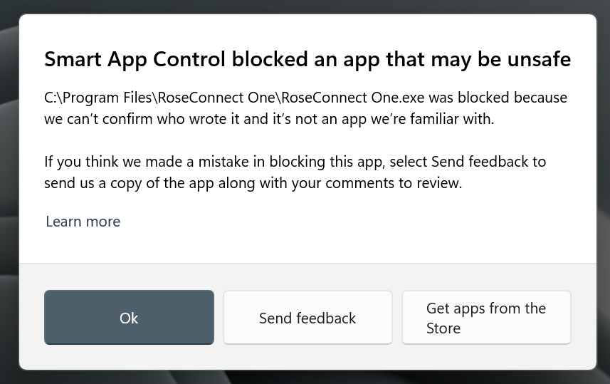 After installing RoseConnect-One-1.0.16_Windows.exe on my Alienware laptop running Windows 11 Pro, I get this message: