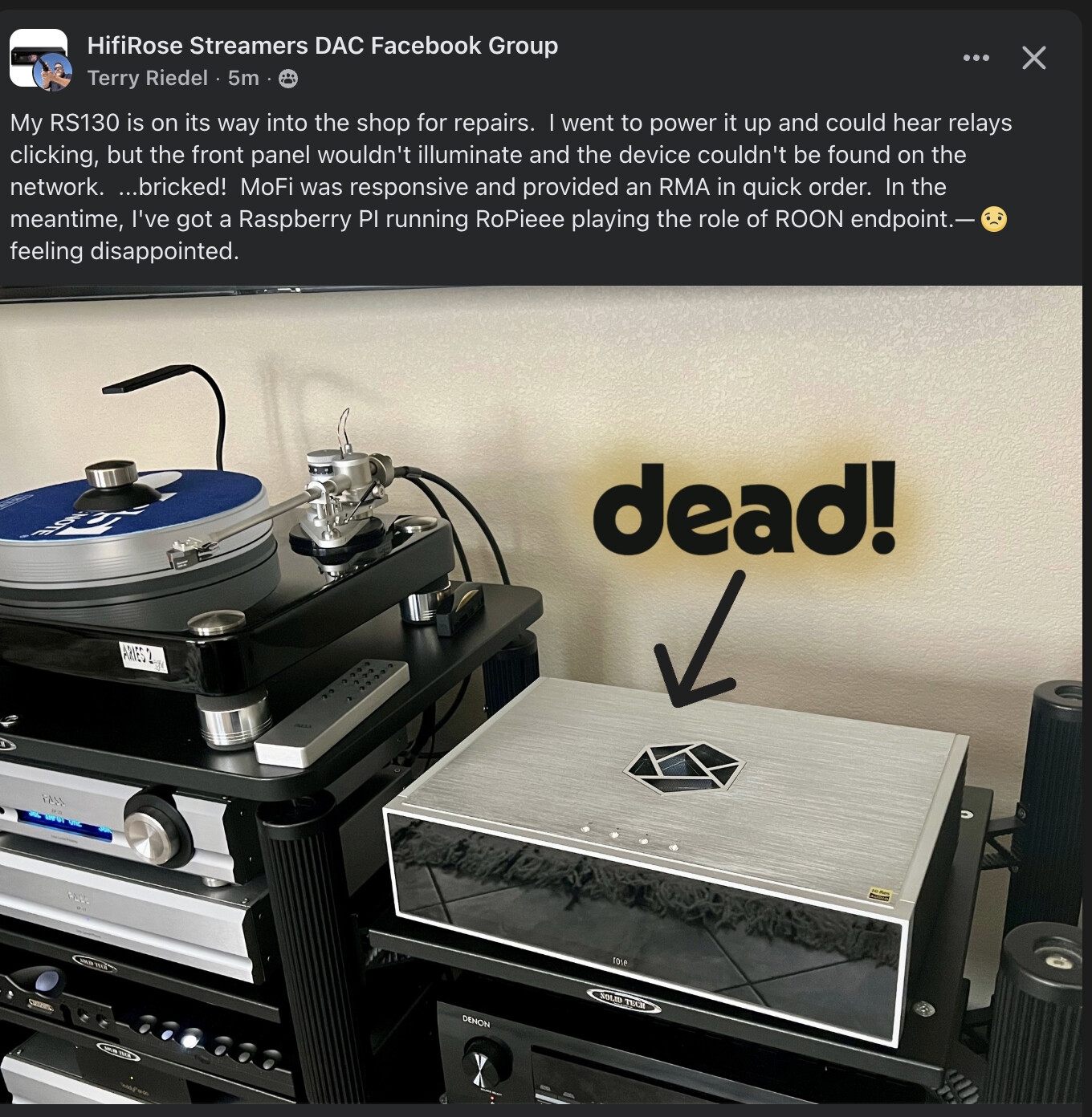 Hello fellow RS 130 owners. I thought I’d add a data point to this discussion. Like others are reporting here, my experience after the latest update has yielded a similar result: I hear relays switching, but the display does not light up and the Rose app doesn’t not see my RS 130 on the network. I have an email out to MoFi for next steps which I assume will be an RMA and a long wait time for repair. My RS 150B worked very well and I gave it to my son so he could enjoy it. Lesson for me is to not have auto updates selected. Hope it turns out well but disappointed nonetheless.