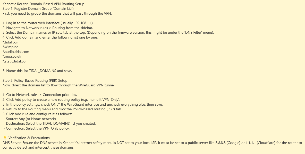 In that case, there may be a feature in your VPN settings or Keenetic Hero router that allows only TIDAL traffic to go through the VPN. Could you please check if such a function is available?
