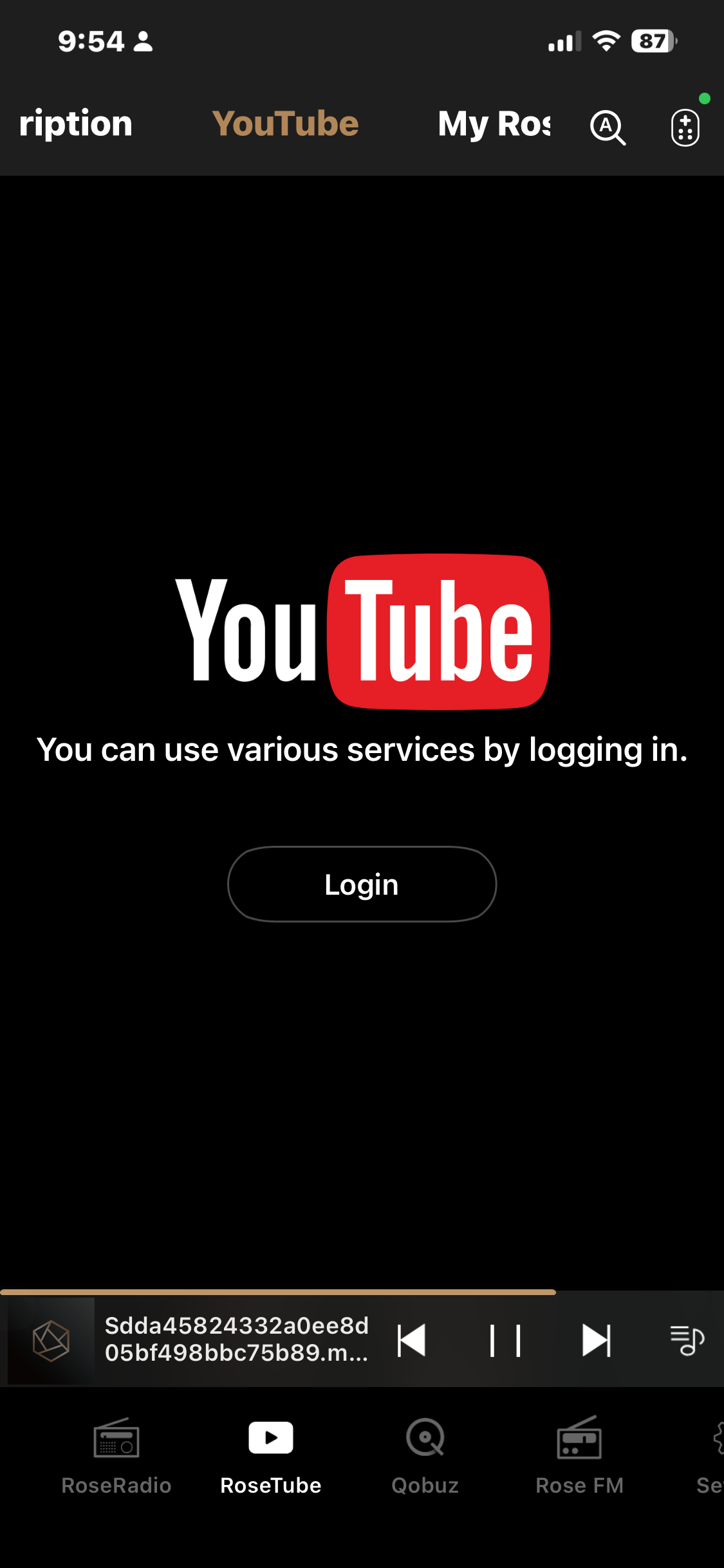 The login is also missing from the RoseTube app on the 150b hardware. It would be convenient to have it in both apps (ONE and Premium Connect) as well as the hardware. The reason is that since we can retrieve our Qobuz, Tidal and Apple music playlists created elsewhere, we should also be able to retrieve our YouTube content/channel.